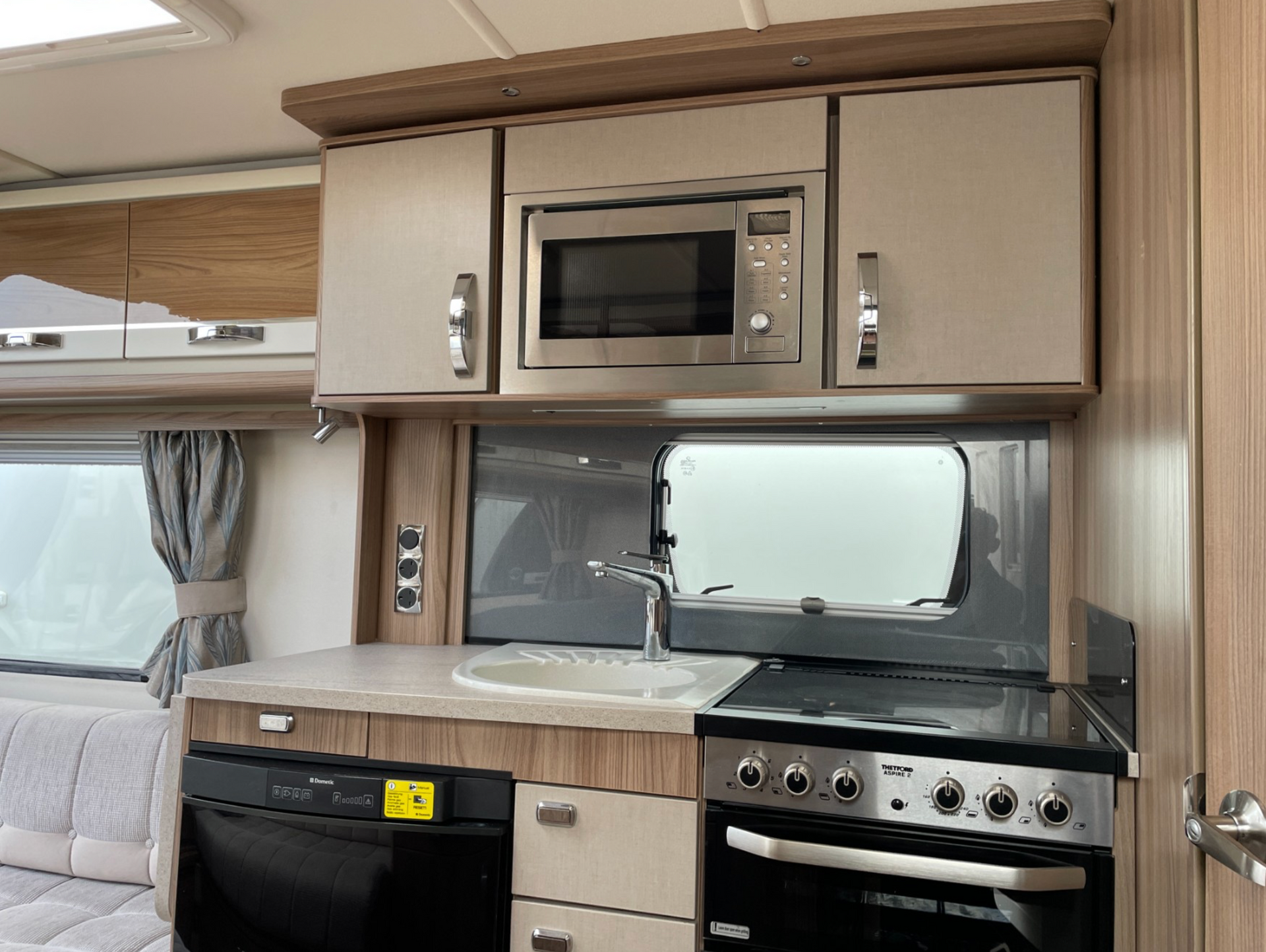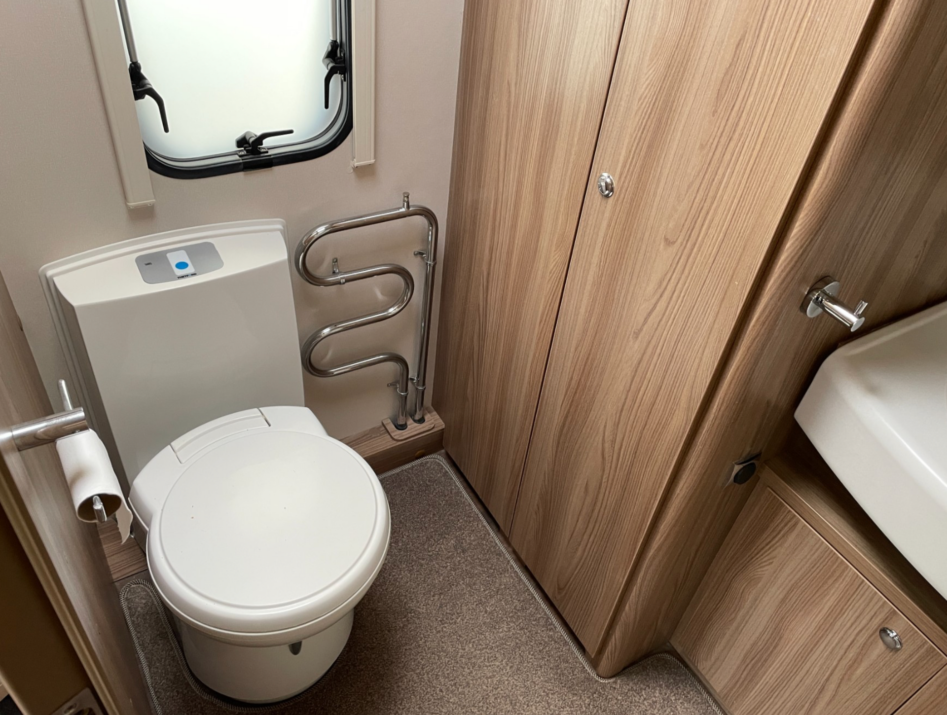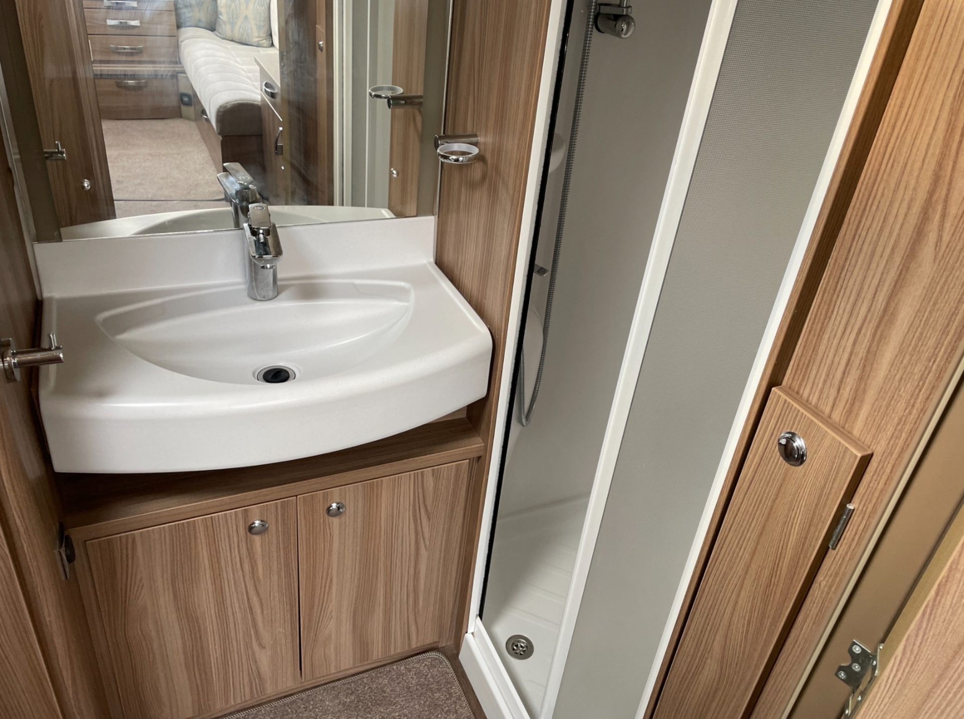The front of the caravan has 2 parallel bench seats with a chest of drawers between them. This area can be used as 2 single beds or converted into a double bed using the pull out slats housed under the chest of drawers. The kitchen is located in the centre of the caravan opposite the main entrance door. There is a large bathroom at the rear of the caravan which houses the separate shower cubicle, toilet, basin and wardrobe.